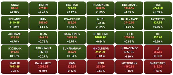 10:17 AM बीएसई सेंसेक्स में शामिल 30 कंपनियों के स्टॉक्स में से 21 में बढ़त और 9 में गिरावट है। ओएनजीसी के शेयर में 5 फीसदी की बढ़त है।